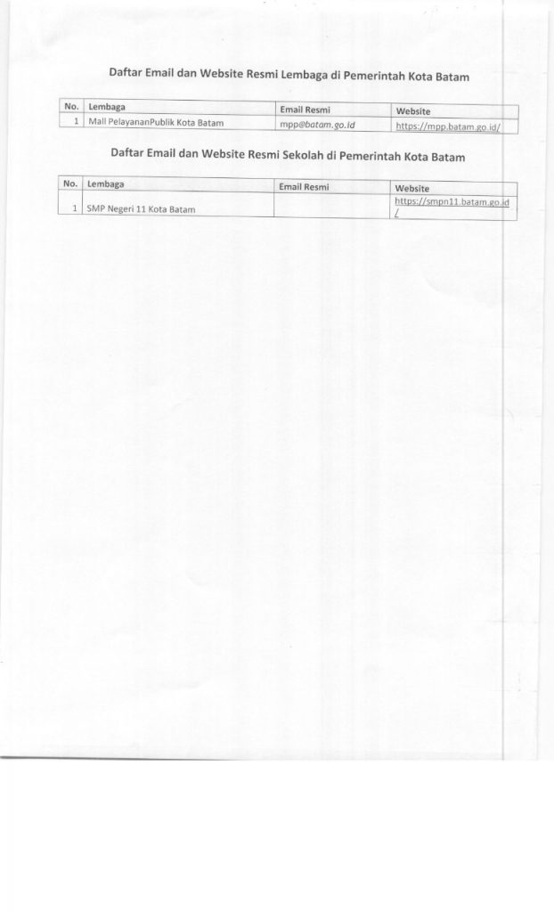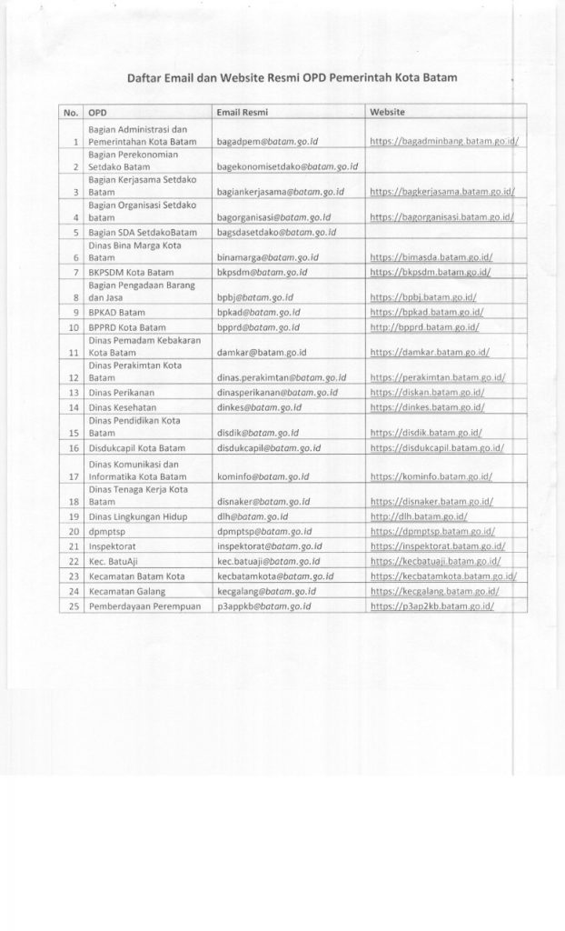 Daftar Email dan Website Resmi Pemerintah Kota Batam oleh mediacenter · Dipublikasikan 27 Februari 2020 · Di update 27 Februari 2020 Post Views: 1