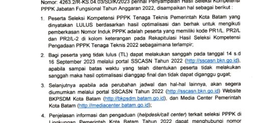 PENGUMUMAN HASIL OPTIMALISASI PENGADAAN PEGAWAI PEMERINTAH DENGAN PERJANJIAN KERJA (PPPK) UNTUK JABATAN FUNGSIONAL TEKNIS DI LINGKUNGAN PEMERINTAH KOTA BATAM TAHUN 2022 15 September 2023 oleh mediacenter · Published 15 September 2023