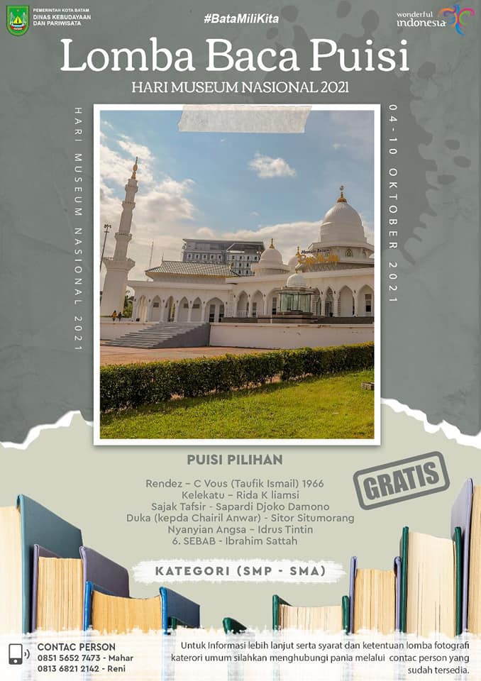 Media Center Batam – Museum Batam Raja Ali Haji menggelar lomba membaca puisi dan lomba foto bertema museum, sejarah, kebudayaan, dan tradisi Melayu Kota Batam. Perlombaan ini dilaksanakan dalam rangka memperingati Hari Museum Nasional yang jatuh pada tanggal 12 Oktober mendatang.
