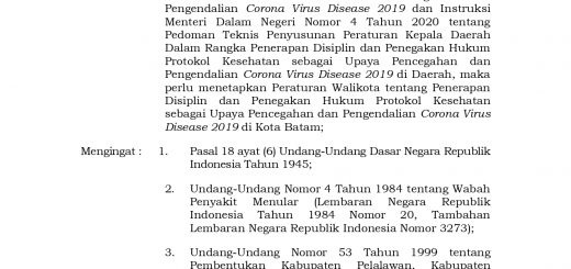 PERATURAN WALIKOTA BATAM NOMOR 49 TAHUN 2020 TENTANG PENERAPAN DISIPLIN DAN PENEGAKAN HUKUM PROTOKOL KESEHATAN SEBAGAI UPAYA PENCEGAHAN DAN PENGENDALIAN CORONA VIRUS DISEASE 2019 DI KOTA BATAM 7 September 2020 oleh mediacenter · Published 7 September 2020 · Last modified 8 September 2020