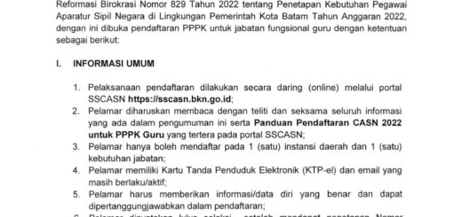 SELEKSI PENGADAAN PEGAWAI PEMERINTAHDENGAN PERJANJIAN KERJA (PPPK) UNTUK JABATAN FUNGSIONAL GURUDI LINGKUNGAN PEMERINTAH KOTA BATAM TAHUN 2022 7 November 2022 oleh mediacenter · Published 7 November 2022