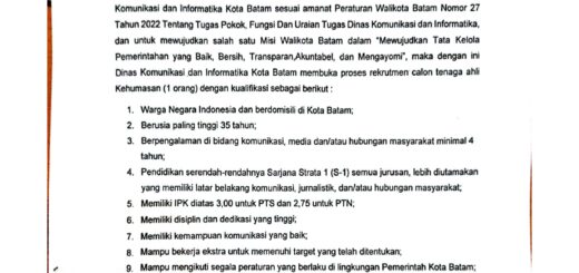 Pengumuman Rekrutmen Tenaga Ahli Kehumasan Dinas Komunikasi dan Informatika Kota Batam 5 Desember 2022 oleh mediacenter · Published 5 Desember 2022