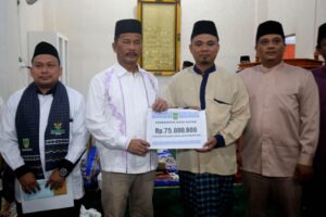 MC Pemko Batam – Wali Kota Batam Haji Muhammad Rudi menyerahkan bantuan dana untuk pembangunan dua masjid saat safari Ramadhan di Kecamatan Sungai Beduk, Sabtu (25/3/2023). Bantuan diberikan untuk Masjid Darul Aman di Kavling Bagan dan Masjid Nurul Huda di Kavling Sungai Daun.