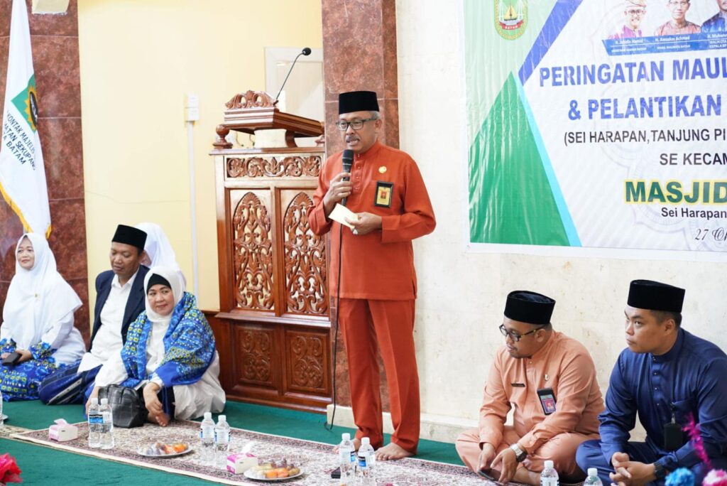 𝐃𝐢𝐬𝐤𝐨𝐦𝐢𝐧𝐟𝐨 𝐁𝐚𝐭𝐚𝐦 – Wali Kota Batam, Muhammad Rudi diwakili Sekretaris Daerah Kota Batam, Jefridin, M.Pd. menghadiri acara peringatan Maulid Nabi Muhammad SAW di Masjid Al-Hikmah Sei Harapan, Jumat (27/10/2023). Acara ini disejalankan dengan pelantikan pengurus Badan Kontak Majelis Taklim (BKMT) Kecataman Sekupang dan Permata Kelurahan Sei Harapan, Tanjung Riau, Tanjung Pinggir dan Kelurahan Tiban Lama. Acara ini juga dihadiri Wakil Gubernur Provinsi Kepri, Marlin Agustina Rudi dan Ketua Umum BKMT Kota Batam, Hasyimah.