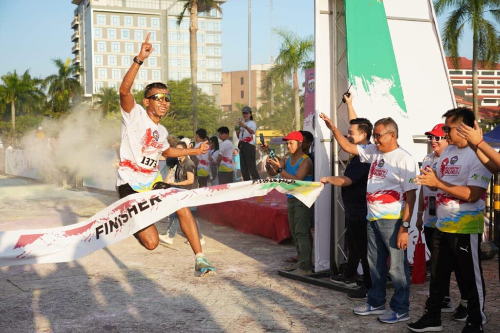 𝐃𝐢𝐬𝐤𝐨𝐦𝐢𝐧𝐟𝐨 𝐁𝐚𝐭𝐚𝐦- wali Kota Batam, Muhammad Rudi diwakili Jefridin, M.Pd. menyambut peserta pertama yang tiba di garis finish di acara Rainbow Run 2.0 di Dataran Engku Putri, Minggu (29/10/2023). Ketibaan para juara rainbow run disambut sorak sorai oleh Jefridin bersama panitia. Para juara yang telah dulu tiba di garis finish langsung disematkan medali.