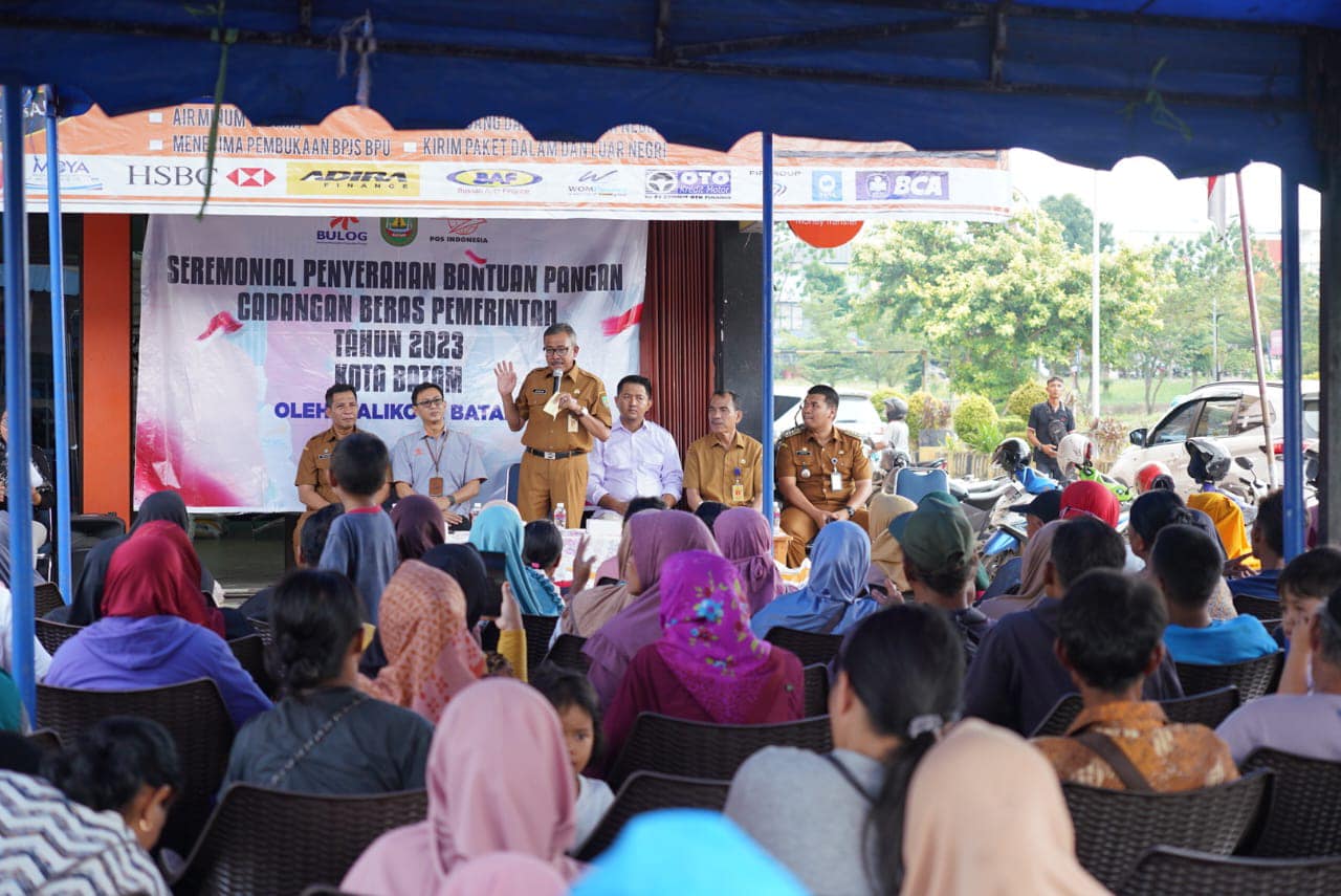 𝐃𝐢𝐬𝐤𝐨𝐦𝐢𝐧𝐟𝐨 𝐁𝐚𝐭𝐚𝐦 – Wali Kota Batam, Muhammad Rudi diwakili Sekretaris Daerah Kota Batam, Jefridin, M.Pd. menyerahkan secara simbolis bantuan pangan cadangan beras pemerintah (CBP) periode November Tahun 2023 di Kantor Pos SP Plaza, Senin (6/11/2023). Adapun jumlah keluarga penerima manfaat (KPM) Kelurahan Tembesi, Kecamatan Sagulung berjumlah 520.