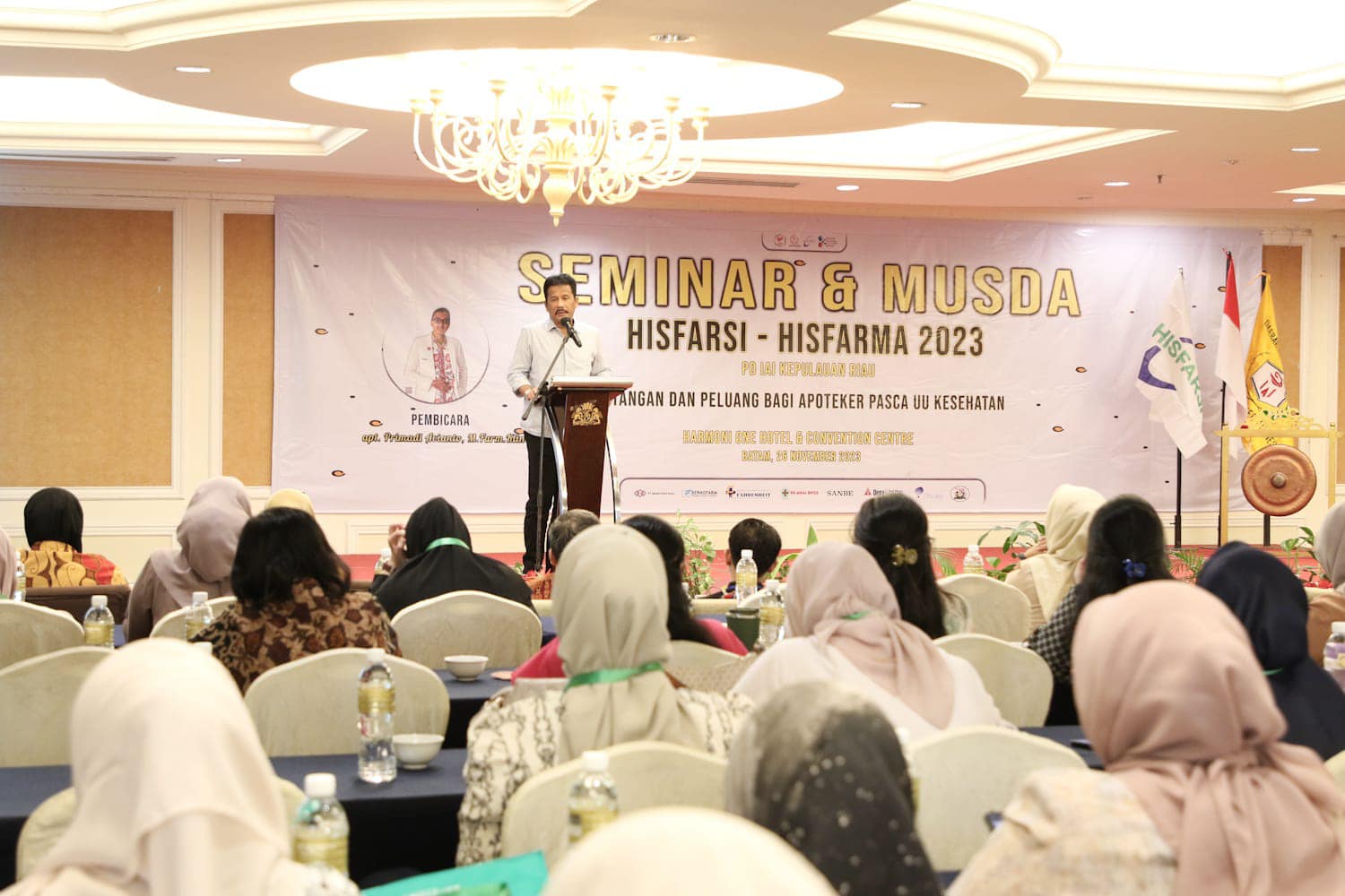 𝐃𝐢𝐬𝐤𝐨𝐦𝐢𝐧𝐟𝐨 𝐁𝐚𝐭𝐚𝐦 – Wali Kota Batam, Muhammad Rudi, membuka seminar dan musyawarah daerah (musda) Himpunan Seminat Farmasi Rumah Sakit (Hisfarsi) dan Himpunan Seminat Farmasi Masyarakat (Hisfarma) PD IAI Kepri di Harmonie One Hotel, Minggu (26/11/2023).