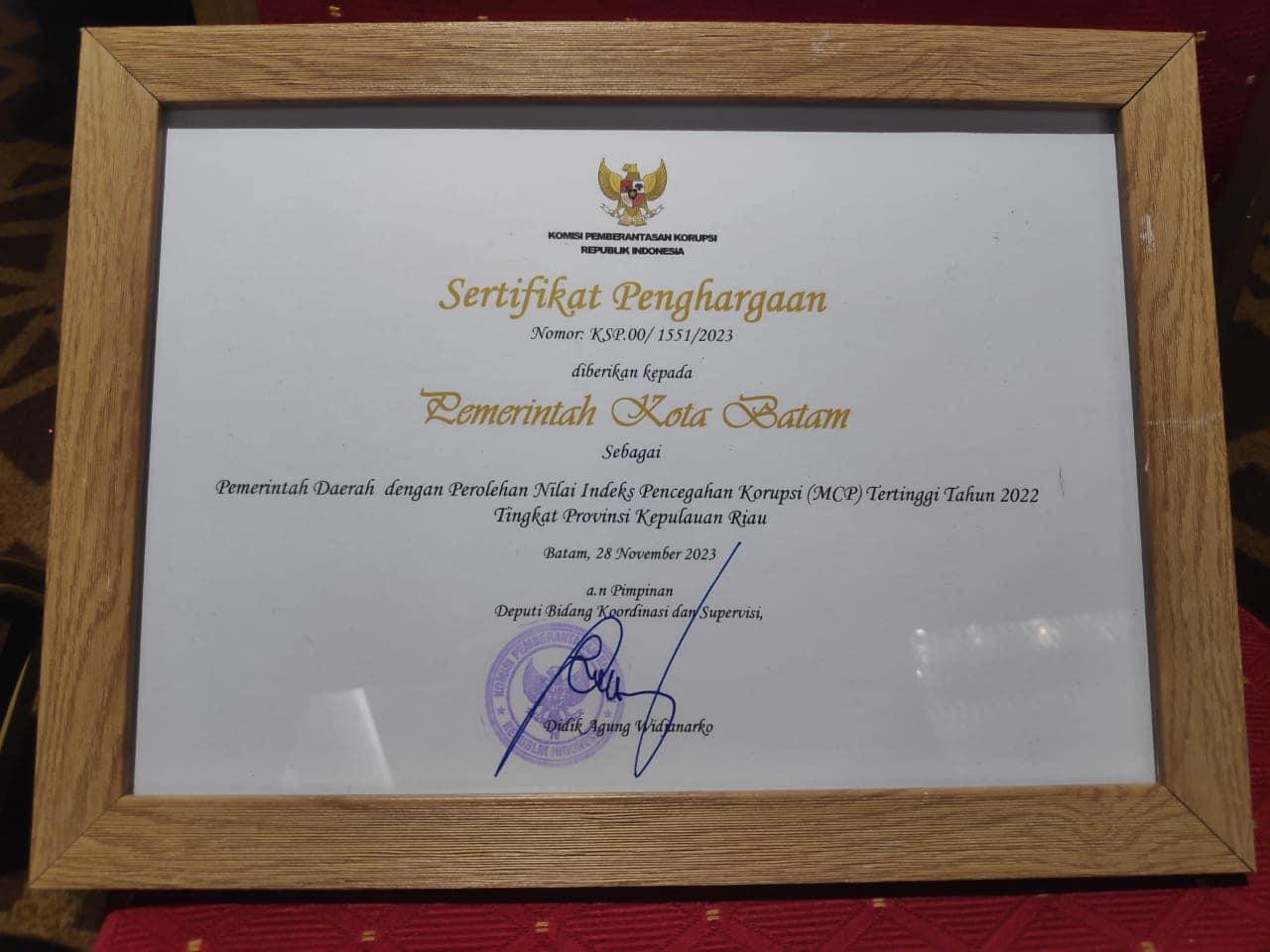 Penghargaan KPK kepada Pemko Batam tersebut diserahkan langsung oleh Direktur Koordinasi & Supervisi Wilayah I KPK, Edi Suryanto, pada Rapat Koordinasi Pengawasan Daerah (Rakorwasda) Provinsi Kepri Tahun 2023 di Swiss Bell Harbour Bay, Selasa 28 November 2023.