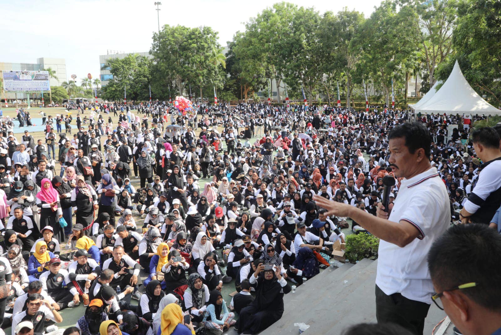 Kedatangan Rudi bersama Ketua Ketua Tim Penggerak Pemberdayaan dan Kesejahteraan Keluarga (TP-PKK) Kota Batam yang juga Wakil Gubenur Kepri, Marlin Agustina disambut antusias ribuan guru di Kota Batam.