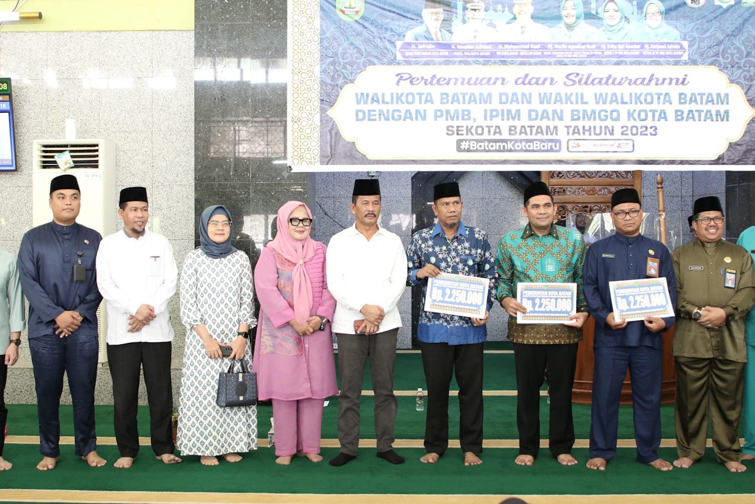 𝐃𝐢𝐬𝐤𝐨𝐦𝐢𝐧𝐟𝐨 𝐁𝐚𝐭𝐚𝐦 – Wali Kota Batam, Muhammad Rudi, bersama Wakil Gubernur Kepri, Marlin Agustina, menyerahkan secara simbolis insentif bagi tokoh agama yang tergabung dalam Ikatan Persaudaraan Imam Masjid (IPIM) Batam, Persatuan Mubalig Kota Batam (PMB), dan Badan Musyawarah Guru Al-Qur’an (BMGQ) triwulan IV se-Kecamatan Sekupang di Masjid Baiturrahman Sekupang, Jumat (15/12/2023).