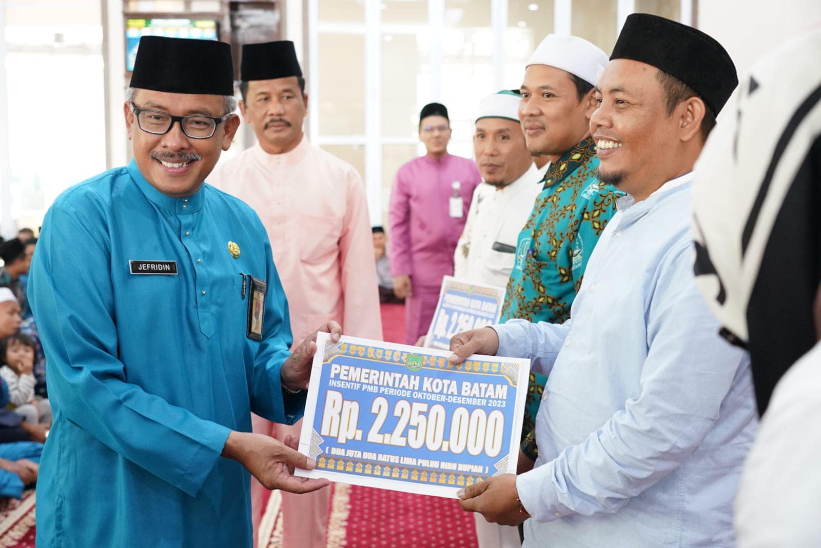 ๐๐ข๐ฌ๐ค๐จ๐ฆ๐ข๐ง๐๐จ ๐๐๐ญ๐๐ฆ – Sekretaris Daerah Kota Batam, Jefridin, M.Pd. mengapresiasi dan berterimakasih kepada imam masjid, mubaligh dan guru BMGQ yang selama ini telah membantu Pemerintah Kota (Pemko) Batam sesuai tugasnya. Hal tersebut disampaikannya saat mendampingi Wali Kota Batam, Muhammad Rudi diacara silahturahmi dan penandatanganan amprah insentif Ikatan Persaudaraan Imam masjid (IPIM), Persatuan Mubaligh Batam (PMB), Badan Musyawarah Guru Qurโan (BMGQ) Triwulan IV Kecamatan Batam Kota di Masjid Al-Azhar Baverly Hill, Kelurahan Belian, Kamis (14/12/2023).