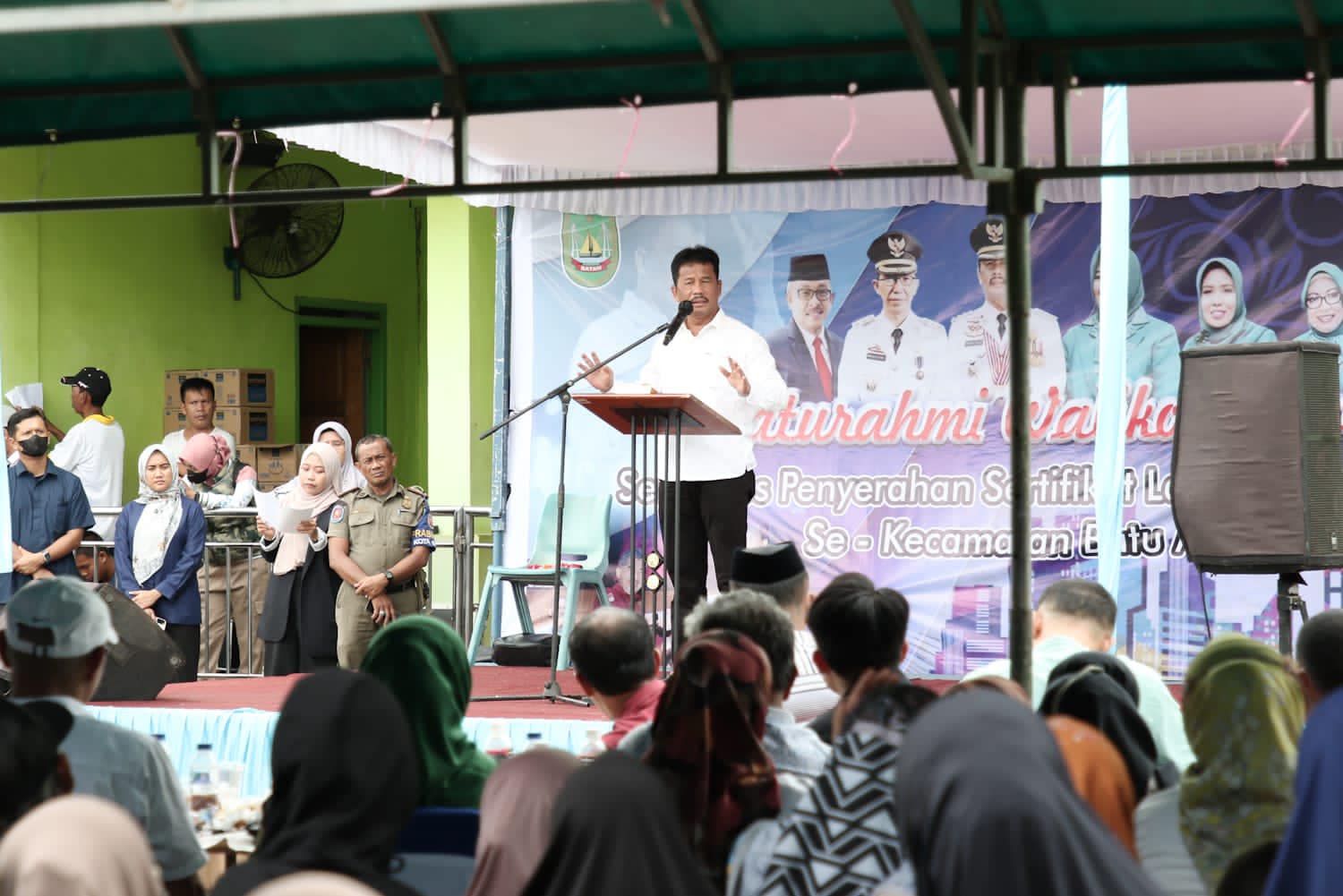 𝐃𝐢𝐬𝐤𝐨𝐦𝐢𝐧𝐟𝐨 𝐁𝐚𝐭𝐚𝐦 – Wali Kota Batam, Muhammad Rudi, memenuhi janjinya menyerahkan sertifikat lahan kampung tua. Kali ini, sebanyak 1.960 sertifikat diberikan untuk masyarakat kampung tua se-Kecamatan Batu Ampar di Halaman Masjid Darul Ihsan Tanjung Sengkuang, Kamis (28/12/2023).