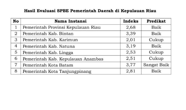 Adapun, seusai Keputusan Menteri Pendayagunaan Aparatur Negara dan Reformasi Birokrasi (PANRB) tentang hasil evaluasi Sistem Pemerintahan Berbasis Elektronik pada instansi instansi pusat dan pemerintah daerah tahun 2023, Batam mendapat nilai 3,77 dengan predikat sangat baik.