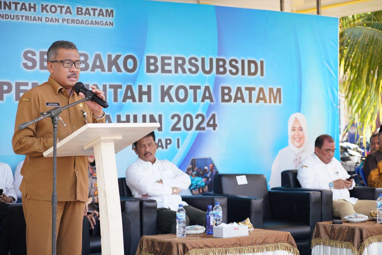 Secara simbolis Jefridin bersama dengan Wali Kotw Batam, Muhammad Rudi dan Wakil Gubernur Provinsi Kepri, Marlin Agustina menyerahkan secara simbolis paket sembako bersubsidi.(*)