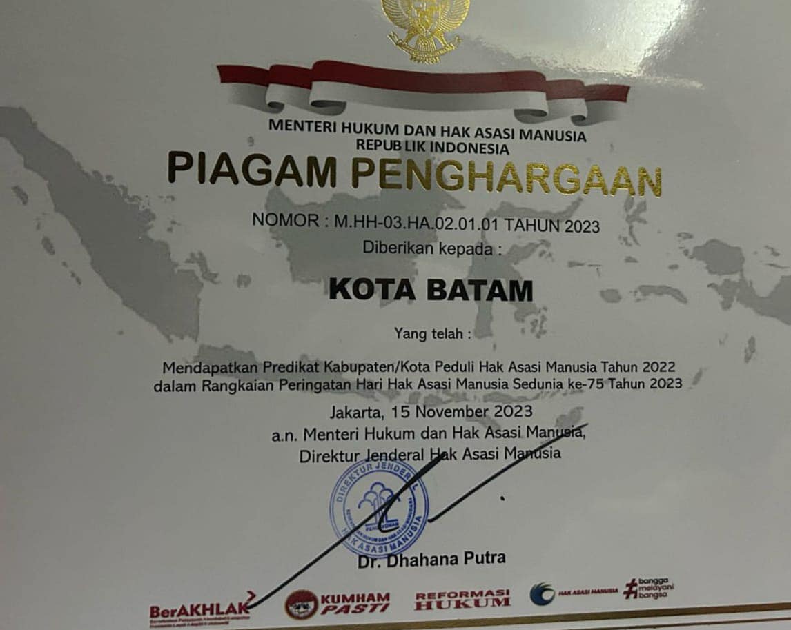 “Kota Batam telah memenuhi indikator ini sehingga mendapatkan penghargaan kab/kota peduli HAM dari Kementerian Hukum dan Hak Asasi Manusia,” ujarnya.
