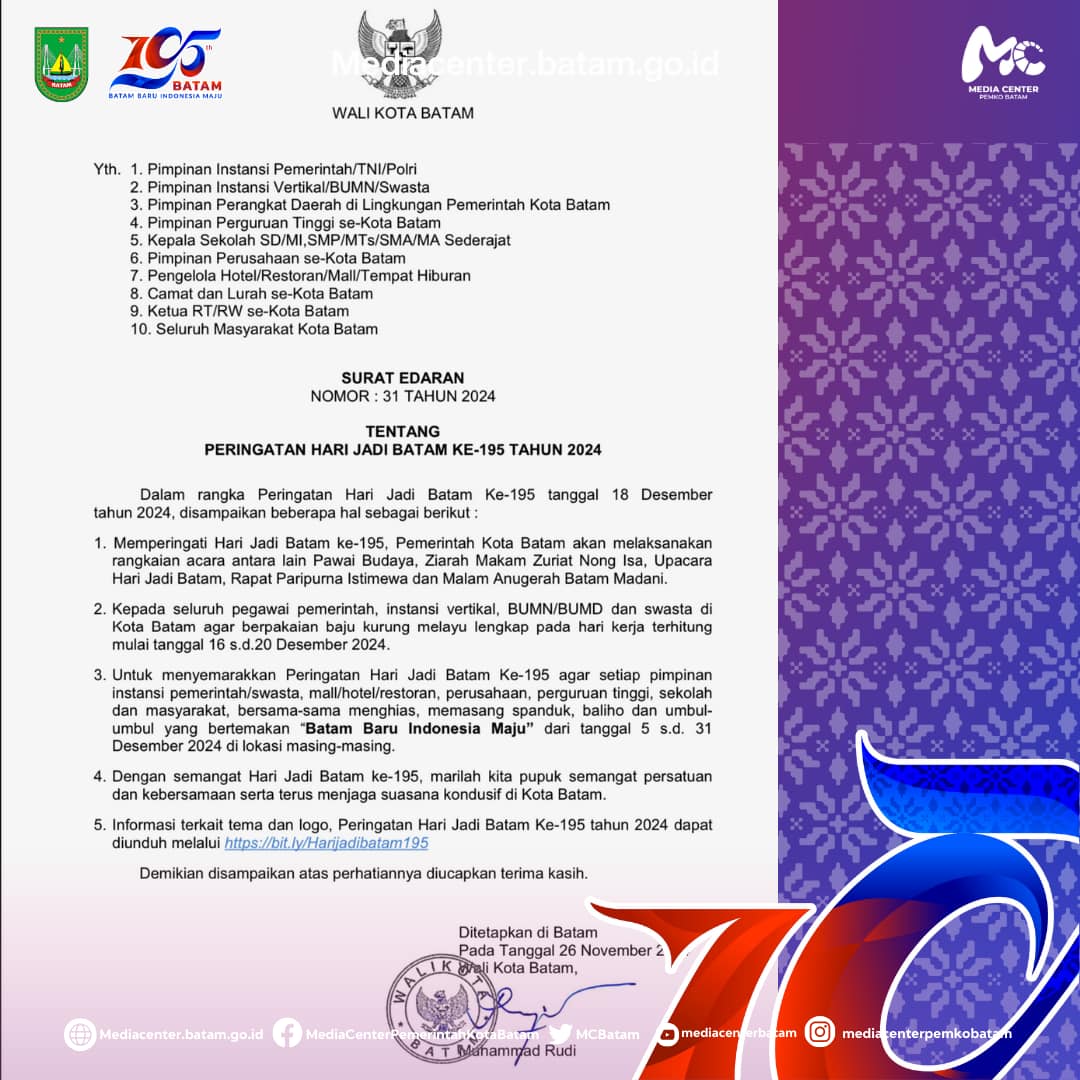 Kemudian, untuk menyemarakkan Peringatan Hari Jadi Batam ke-195 agar setiap pimpinan instansi pemerintah/swasta, mall/ hotel/restoran, perusahaan, perguruan tinggi, sekolah dan masyarakat, bersama-sama menghias, memasang spanduk, baliho dan umbul- umbul yang bertemakan โBatam Baru Indonesia Majuโ dari tanggal 5 s.d. 31 Desember 2024 di lokasi masing-masing.