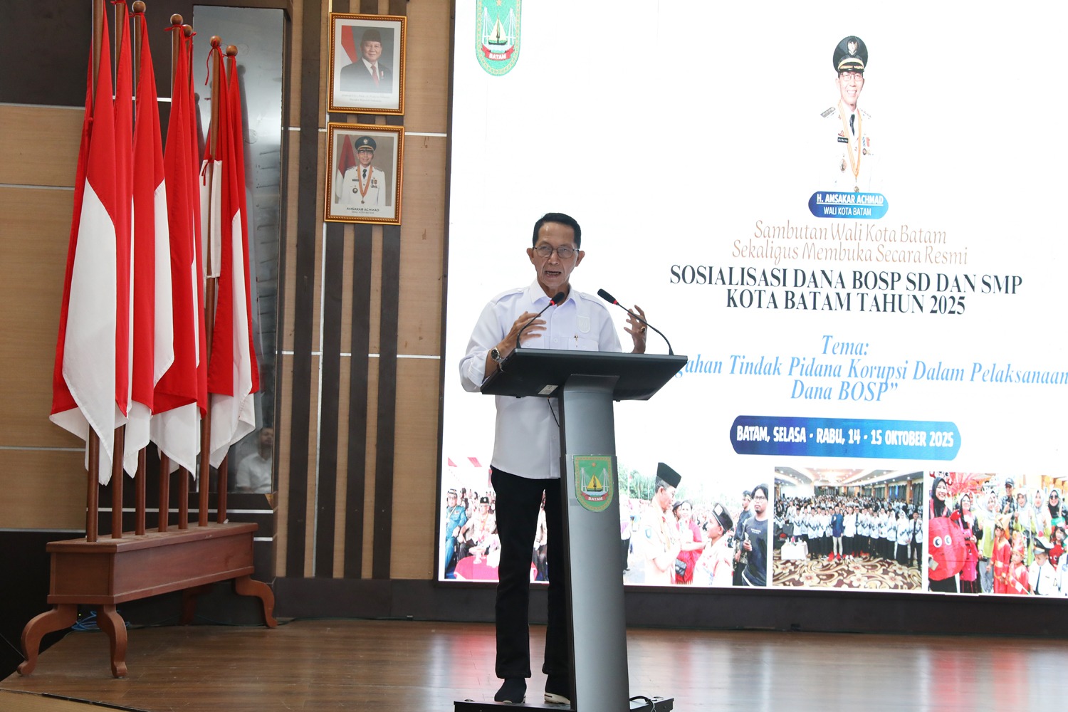 Diskominfo Batam – Wali Kota Batam, Amsakar Achmad, secara resmi membuka kegiatan Sosialisasi Dana Bantuan Operasional Satuan Pendidikan (BOSP) SD dan SMP Kota Batam Tahun 2025, yang digelar di Kantor Wali Kota Batam, Rabu (15/10/2025). Kegiatan ini mengusung tema “Pencegahan Tindak Pidana Korupsi dalam Pelaksanaan Dana BOSP” dan dihadiri oleh para kepala sekolah serta pengelola dana pendidikan di lingkungan Pemerintah Kota Batam.