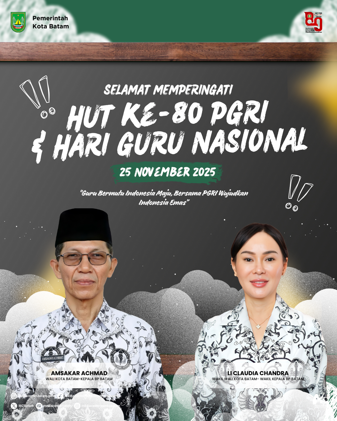 Wali Kota Batam, Amsakar Achmad, dan Wakil Wali Kota Batam, Li Claudia Chandra, menyampaikan apresiasi setinggi-tingginya kepada seluruh insan pendidik yang telah berperan besar dalam mencerdaskan generasi muda, mewujudkan Indonesia Emas, dan menjadikan Batam sebagai kota yang unggul dalam sumber daya manusia.