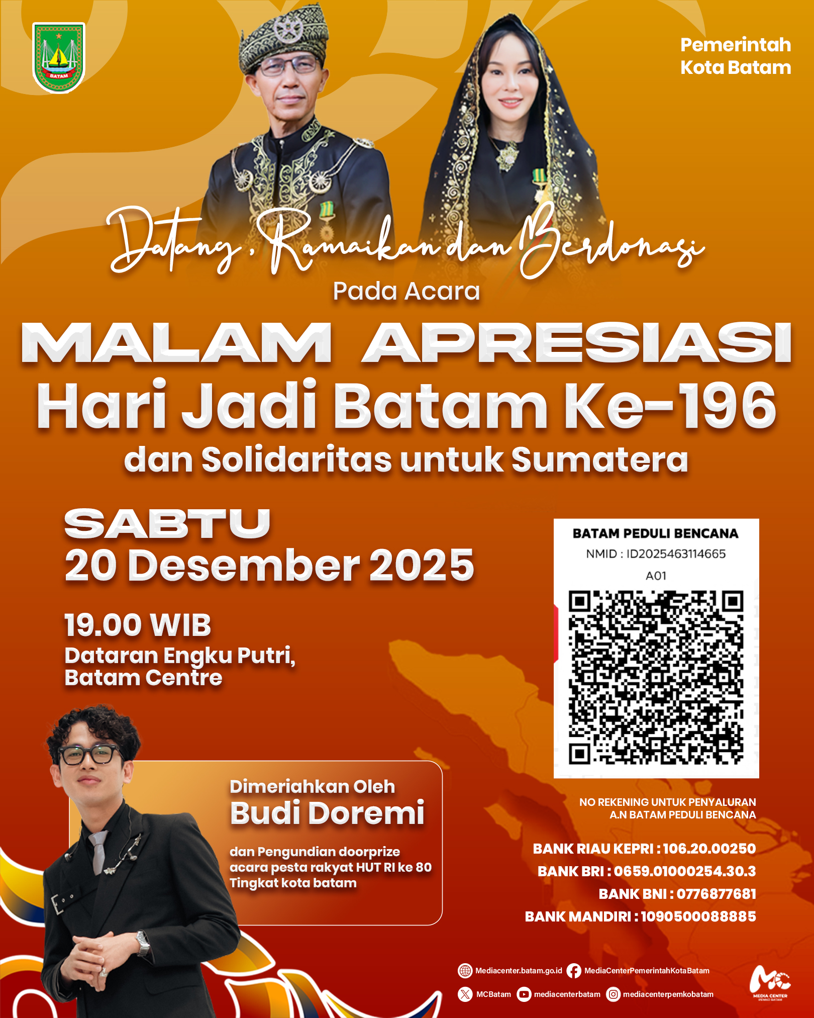 Dalam rangka Malam Apresiasi Hari Jadi Batam ke-196 sekaligus Solidaritas untuk Sumatera, Pemerintah Kota Batam mengajak seluruh masyarakat untuk hadir dan merayakan kebersamaan dalam semangat solidaritas dan kepedulian.