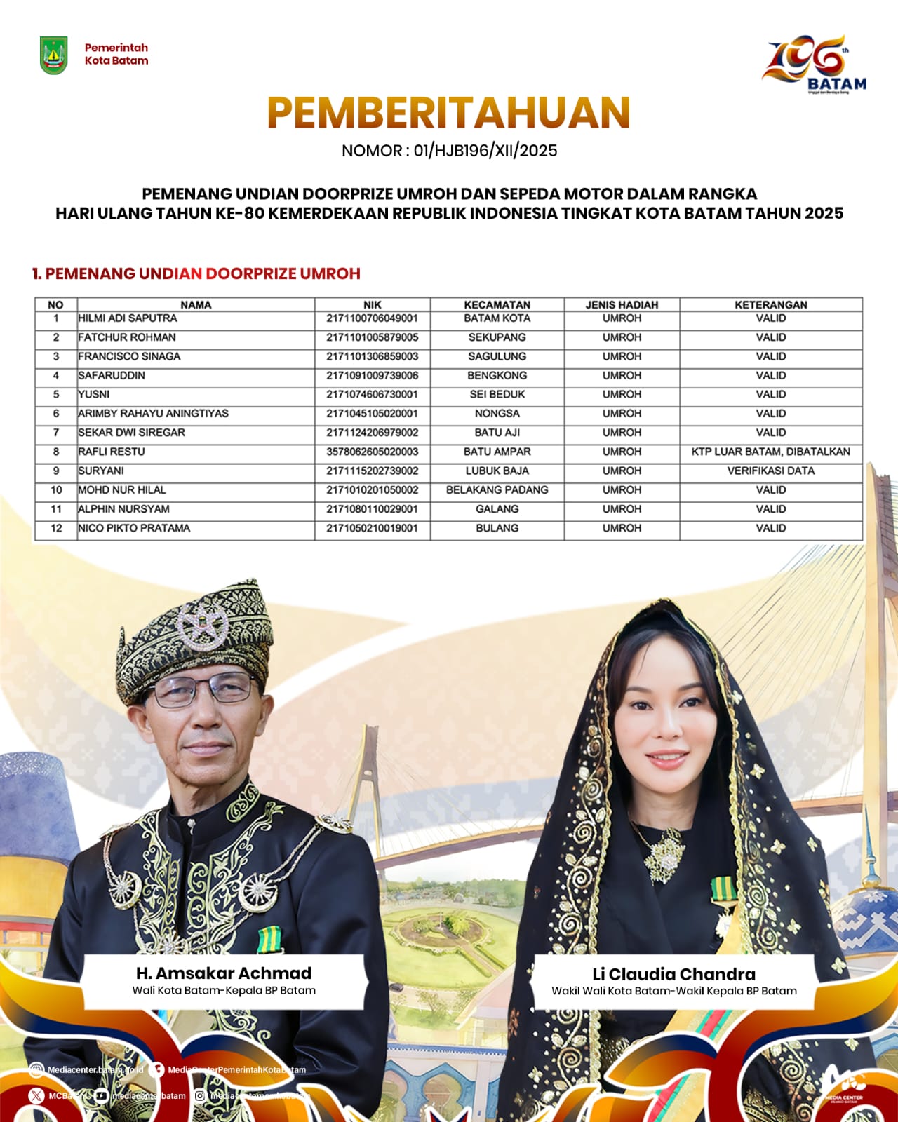 Pemerintah Kota Batam mengumumkan daftar Pemenang Undian Doorprize Sepeda Motor dan Umroh dalam rangka HUT ke-80 RI pada acara Malam Apresiasi Hari Jadi Batam ke-196 dan Solidaritas untuk Sumatera Tahun 2025, yang diselenggarakan pada Sabtu, 20 Desember 2025, di Dataran Engku Puteri, Batamcentre.