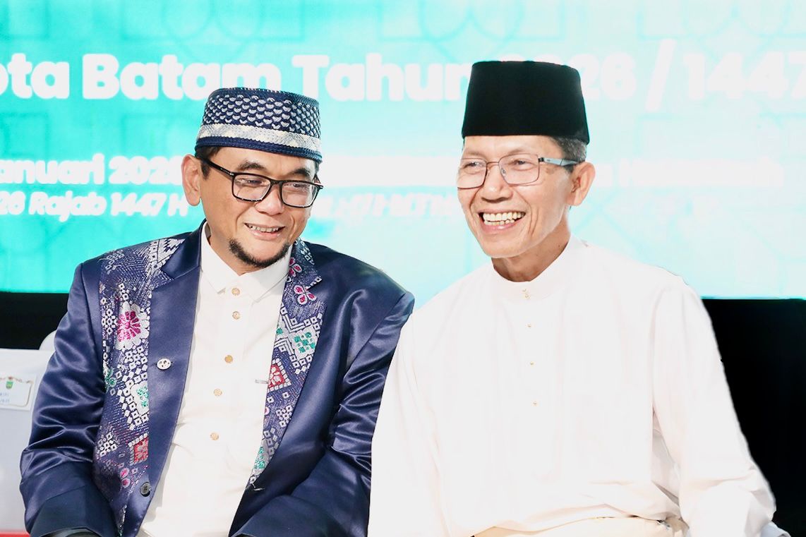 Wali Kota Batam, Amsakar Achmad, bersama Ustaz Subki Al-Bughury, saat menghadiri peringatan Isra Mikraj tingkat Kota Batam di Masjid Agung Raja Hamidah, Batamcentre, Kamis (15/1/2026) malam. HUMAS DISKOMINFO BATAM / RUMAWI