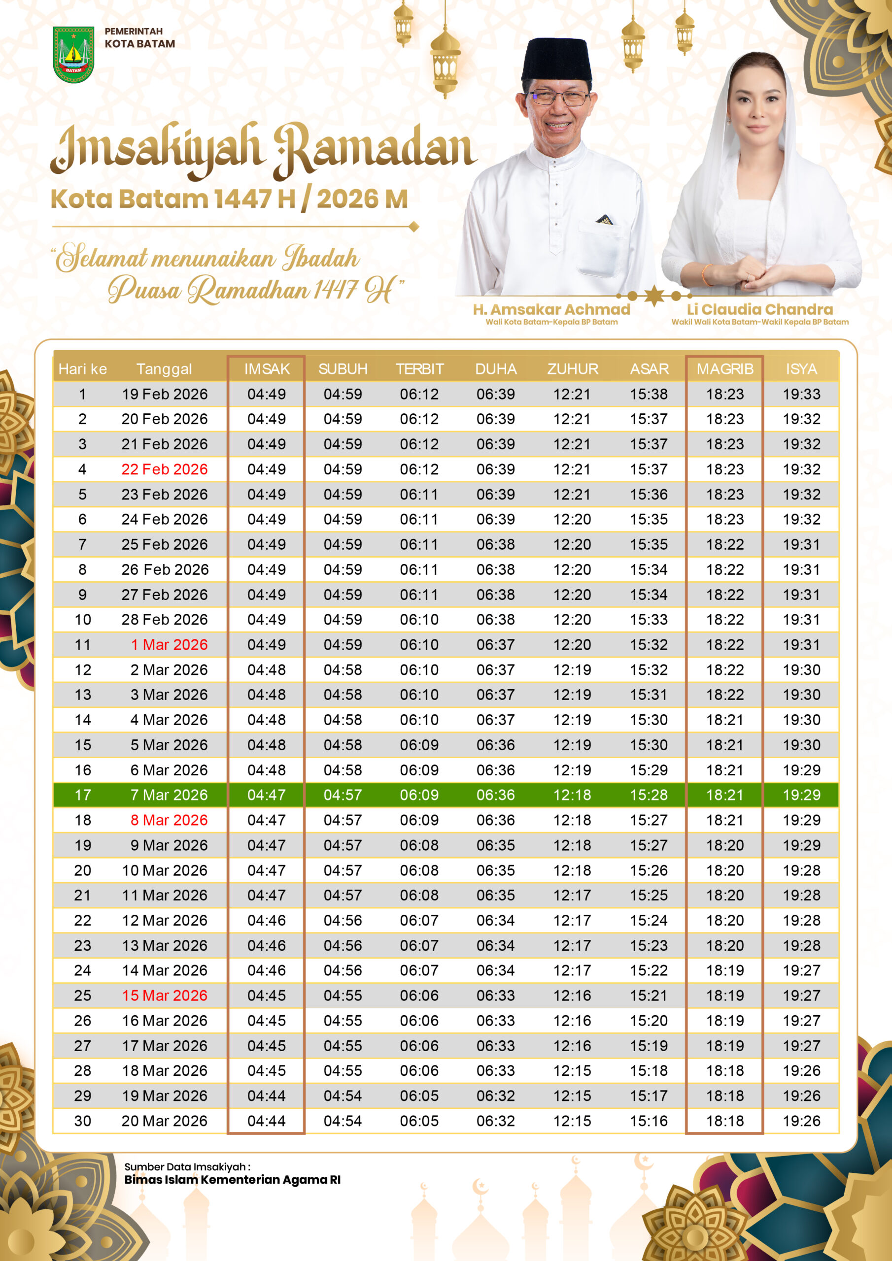 Pemerintah Kota Batam menghadirkan jadwal imsakiyah Ramadan 1447 H / 2026 M sebagai panduan jadwal imsak dan berbuka puasa bagi masyarakat yang menjalankan ibadah puasa. Semoga Ramadan tahun ini membawa keberkahan, ketenangan dan semakin mempererat kebersamaan.