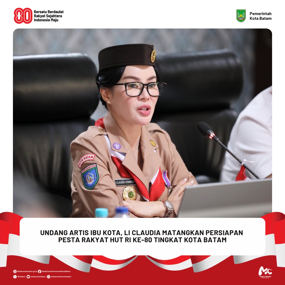 Batam / Berita / Wakil Walikota 21 Agustus 2025 oleh mediacenter · Published 21 Agustus 2025 𝐔𝐧𝐝𝐚𝐧𝐠 𝐀𝐫𝐭𝐢𝐬 𝐈𝐛𝐮 𝐊𝐨𝐭𝐚, 𝐋𝐢 𝐂𝐥𝐚𝐮𝐝𝐢𝐚 𝐌𝐚𝐭𝐚𝐧𝐠𝐤𝐚𝐧 𝐏𝐞𝐫𝐬𝐢𝐚𝐩𝐚𝐧 𝐏𝐞𝐬𝐭𝐚 𝐑𝐚𝐤𝐲𝐚𝐭 𝐇𝐔𝐓 𝐑𝐈 𝐤𝐞-𝟖𝟎 𝐓𝐢𝐧𝐠𝐤𝐚𝐭 𝐊𝐨𝐭𝐚 𝐁𝐚𝐭𝐚𝐦 𝐃𝐢𝐬𝐤𝐨𝐦𝐢𝐧𝐟𝐨 𝐁𝐚𝐭𝐚𝐦 – Wakil Wali Kota Batam, Li Claudia Chandra, memimpin rapat persiapan Pesta Rakyat dalam rangka Hari...