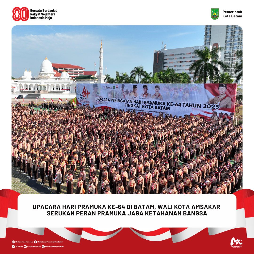 Berita / HUT PRAMUKA / Walikota 19 Agustus 2025 oleh mediacenter · Published 19 Agustus 2025 𝐔𝐩𝐚𝐜𝐚𝐫𝐚 𝐇𝐚𝐫𝐢 𝐏𝐫𝐚𝐦𝐮𝐤𝐚 𝐤𝐞-𝟔𝟒 𝐝𝐢 𝐁𝐚𝐭𝐚𝐦, 𝐖𝐚𝐥𝐢 𝐊𝐨𝐭𝐚 𝐀𝐦𝐬𝐚𝐤𝐚𝐫 𝐒𝐞𝐫𝐮𝐤𝐚𝐧 𝐏𝐞𝐫𝐚𝐧 𝐏𝐫𝐚𝐦𝐮𝐤𝐚 𝐉𝐚𝐠𝐚 𝐊𝐞𝐭𝐚𝐡𝐚𝐧𝐚𝐧 𝐁𝐚𝐧𝐠𝐬𝐚 𝐃𝐢𝐬𝐤𝐨𝐦𝐢𝐧𝐟𝐨 𝐁𝐚𝐭𝐚𝐦 – Ribuan anggota Pramuka dari berbagai gugus depan, kwartir cabang, dan ranting se-Kota Batam memenuhi Dataran...