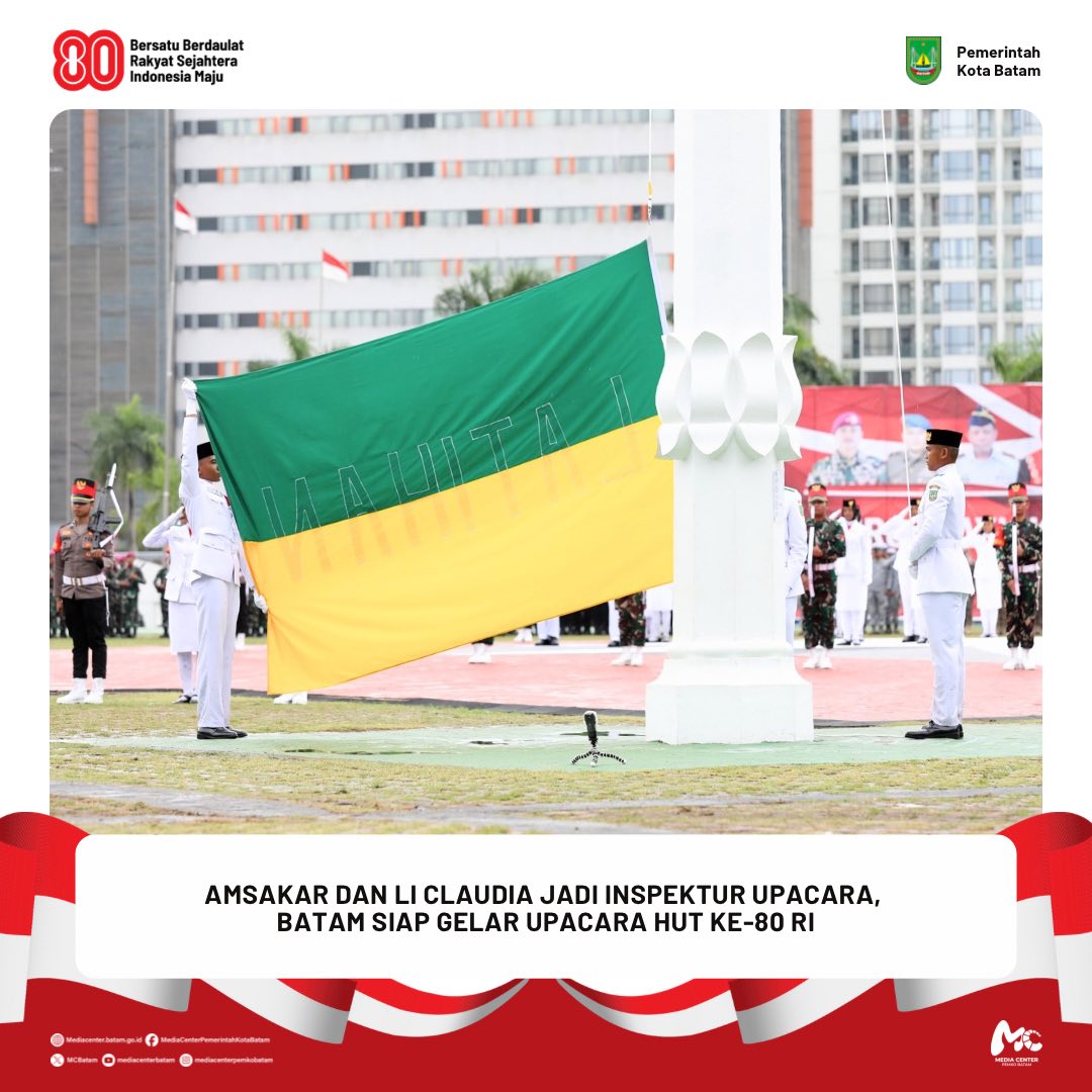 Batam / Berita / Walikota 16 Agustus 2025 oleh mediacenter · Published 16 Agustus 2025 𝐀𝐦𝐬𝐚𝐤𝐚𝐫 𝐝𝐚𝐧 𝐋𝐢 𝐂𝐥𝐚𝐮𝐝𝐢𝐚 𝐉𝐚𝐝𝐢 𝐈𝐧𝐬𝐩𝐞𝐤𝐭𝐮𝐫 𝐔𝐩𝐚𝐜𝐚𝐫𝐚, 𝐁𝐚𝐭𝐚𝐦 𝐒𝐢𝐚𝐩 𝐆𝐞𝐥𝐚𝐫 𝐔𝐩𝐚𝐜𝐚𝐫𝐚 𝐇𝐔𝐓 𝐤𝐞-𝟖𝟎 𝐑𝐈 𝐃𝐢𝐬𝐤𝐨𝐦𝐢𝐧𝐟𝐨 𝐁𝐚𝐭𝐚𝐦 – Kota Batam siap menggelar rangkaian upacara peringatan Hari Ulang Tahun (HUT) ke-80 Kemerdekaan Republik Indonesia...