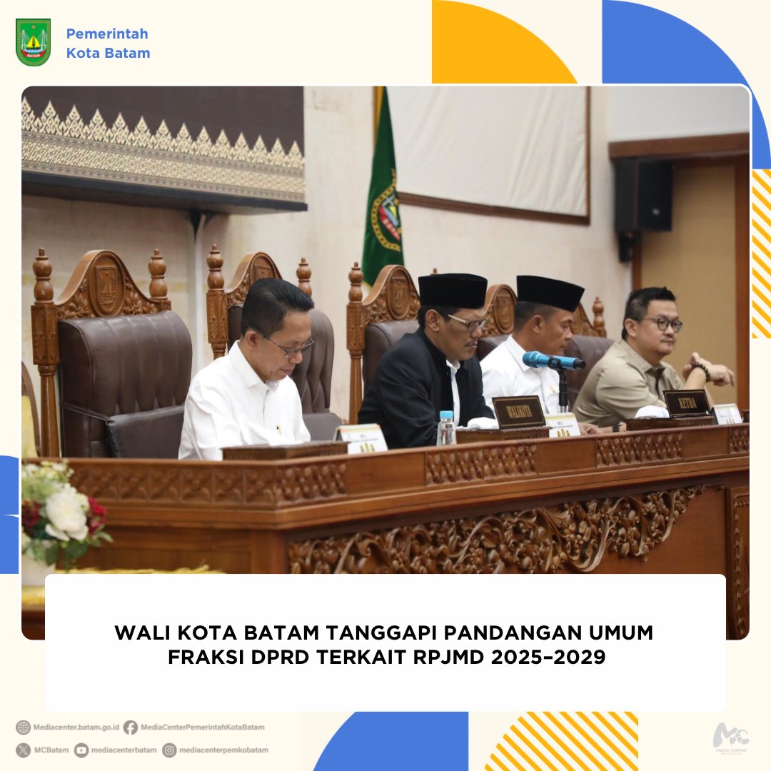 Batam / Berita / Walikota 29 Mei 2025 oleh mediacenter · Published 29 Mei 2025 𝐖𝐚𝐥𝐢 𝐊𝐨𝐭𝐚 𝐁𝐚𝐭𝐚𝐦 𝐓𝐚𝐧𝐠𝐠𝐚𝐩𝐢 𝐏𝐚𝐧𝐝𝐚𝐧𝐠𝐚𝐧 𝐔𝐦𝐮𝐦 𝐅𝐫𝐚𝐤𝐬𝐢 𝐃𝐏𝐑𝐃 𝐓𝐞𝐫𝐤𝐚𝐢𝐭 𝐑𝐏𝐉𝐌𝐃 𝟐𝟎𝟐𝟓–𝟐𝟎𝟐𝟗 𝐃𝐢𝐬𝐤𝐨𝐦𝐢𝐧𝐟𝐨 𝐁𝐚𝐭𝐚𝐦 – Wali Kota Batam, Amsakar Achmad, menyampaikan tanggapan atas pandangan umum fraksi-fraksi terkait Rancangan Peraturan Daerah...