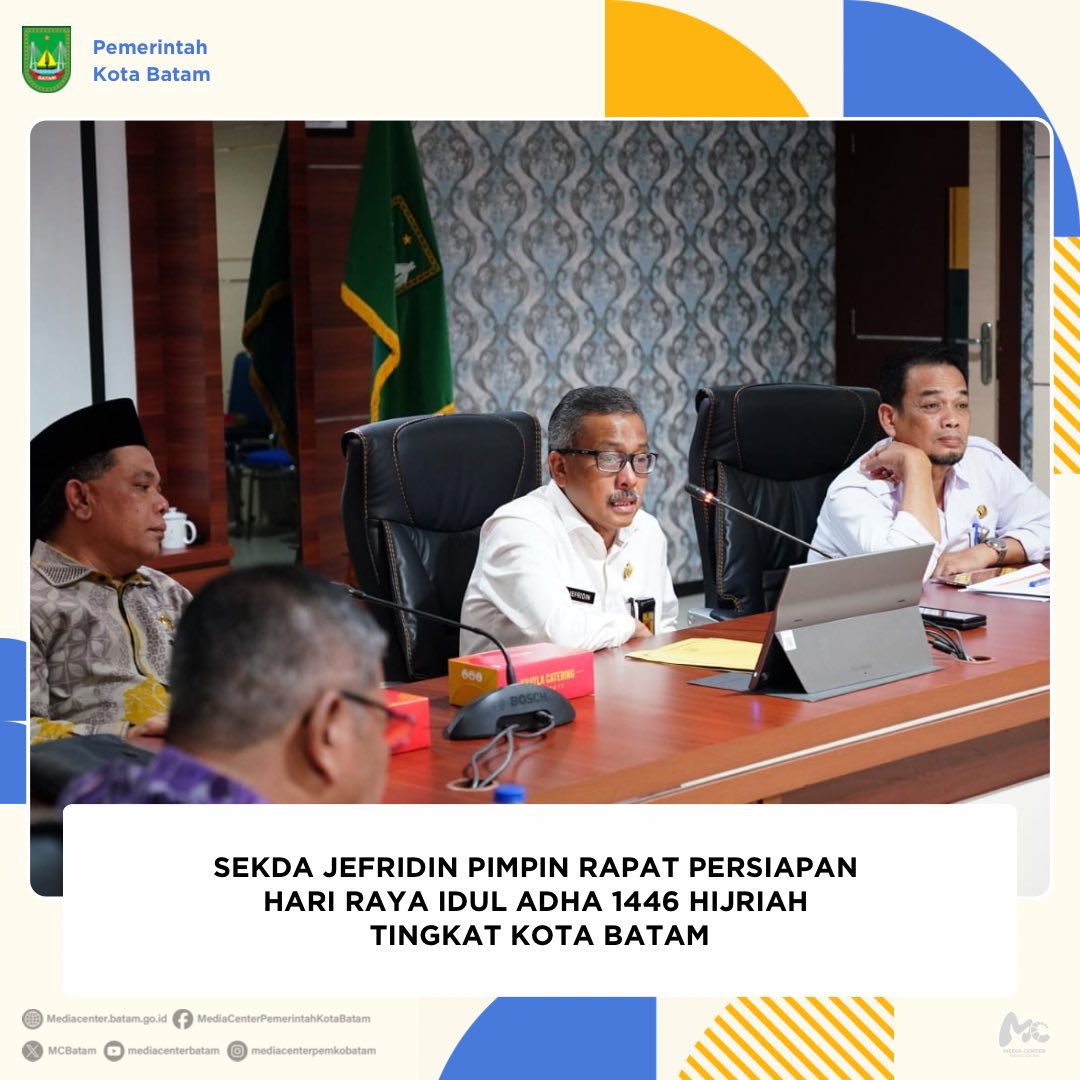 Berita / RAPAT PERSIAPAN / Sekda 29 Mei 2025 oleh mediacenter · Published 29 Mei 2025 𝐒𝐞𝐤𝐝𝐚 𝐉𝐞𝐟𝐫𝐢𝐝𝐢𝐧 𝐏𝐢𝐦𝐩𝐢𝐧 𝐑𝐚𝐩𝐚𝐭 𝐏𝐞𝐫𝐬𝐢𝐚𝐩𝐚𝐧 𝐇𝐚𝐫𝐢 𝐑𝐚𝐲𝐚 𝐈𝐝𝐮𝐥 𝐀𝐝𝐡𝐚 𝟏𝟒𝟒𝟔 𝐇𝐢𝐣𝐫𝐢𝐚𝐡 𝐓𝐢𝐧𝐠𝐤𝐚𝐭 𝐊𝐨𝐭𝐚 𝐁𝐚𝐭𝐚𝐦 𝐃𝐢𝐬𝐤𝐨𝐦𝐢𝐧𝐟𝐨 𝐁𝐚𝐭𝐚𝐦- Wali Kota Batam, Amsakar Achmad diwakili Sekretaris Daerah Kota Batam, Jefridin, M.Pd. memimpin rapat Persiapan Hari...