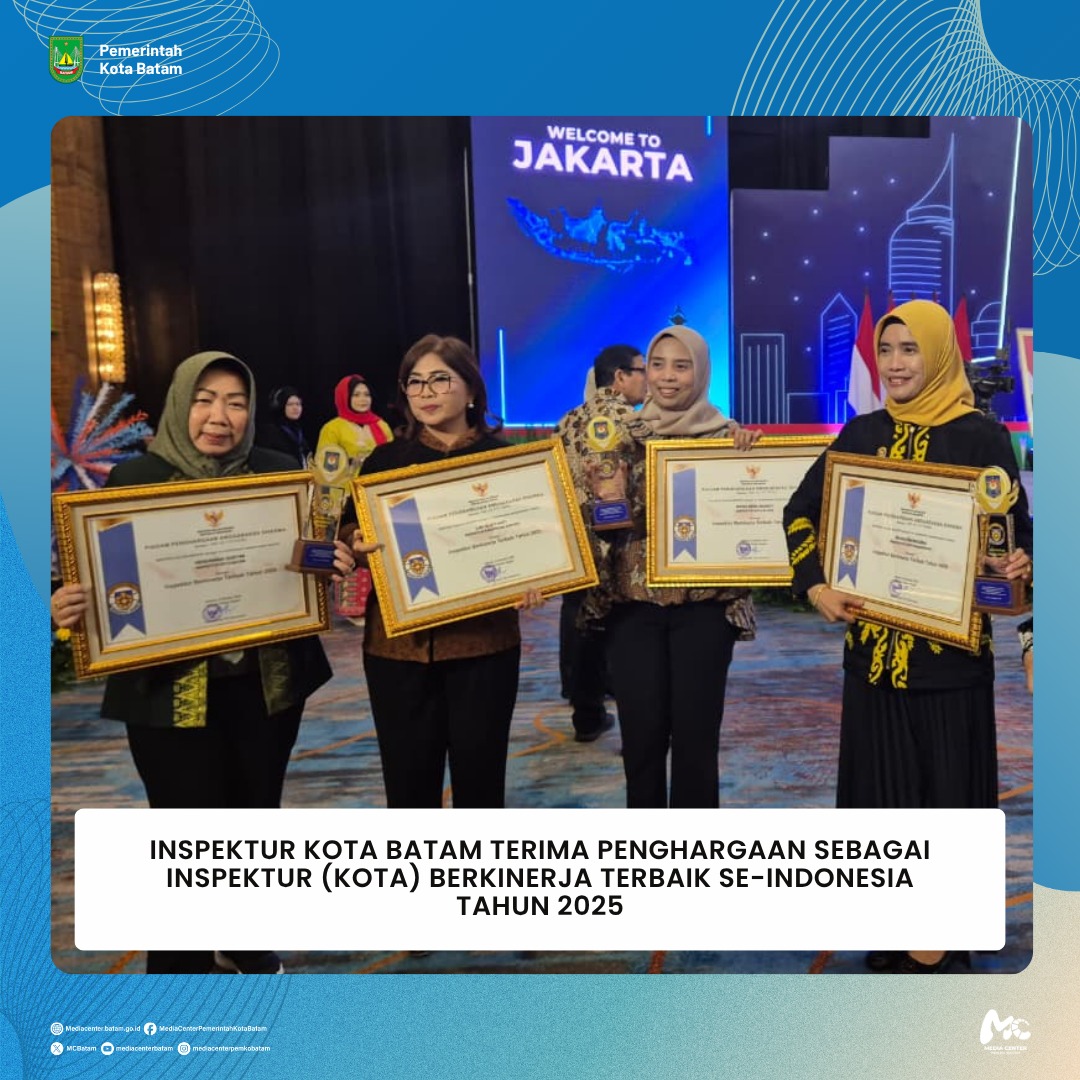 Batam / Berita / PEMKO BATAM 11 Oktober 2025 oleh mediacenter · Published 11 Oktober 2025 Inspektur Kota Batam Terima Penghargaan Sebagai Inspektur (Kota) Berkinerja Terbaik Se-Indonesia Tahun 2025 Diskominfo Batam – Inspektur Kota Batam, Hendriana Gustini, menerima Piagam Penghargaan Anggaraksa Dharma sebagai Inspektur Berkinerja Terbaik ke...