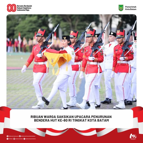 Berita / HUT RI KE - 80 / Wakil Walikota 17 Agustus 2025 oleh mediacenter · Published 17 Agustus 2025 𝐑𝐢𝐛𝐮𝐚𝐧 𝐖𝐚𝐫𝐠𝐚 𝐒𝐚𝐤𝐬𝐢𝐤𝐚𝐧 𝐔𝐩𝐚𝐜𝐚𝐫𝐚 𝐏𝐞𝐧𝐮𝐫𝐮𝐧𝐚𝐧 𝐁𝐞𝐧𝐝𝐞𝐫𝐚 𝐇𝐔𝐓 𝐤𝐞-𝟖𝟎 𝐑𝐈 𝐓𝐢𝐧𝐠𝐤𝐚𝐭 𝐊𝐨𝐭𝐚 𝐁𝐚𝐭𝐚𝐦 𝐃𝐢𝐬𝐤𝐨𝐦𝐢𝐧𝐟𝐨 𝐁𝐚𝐭𝐚𝐦 – Ribuan masyarakat memadati Dataran Engku Putri Batam Centre, Minggu (17/8/2025), untuk menyaksikan Upacara Penurunan Bendera...