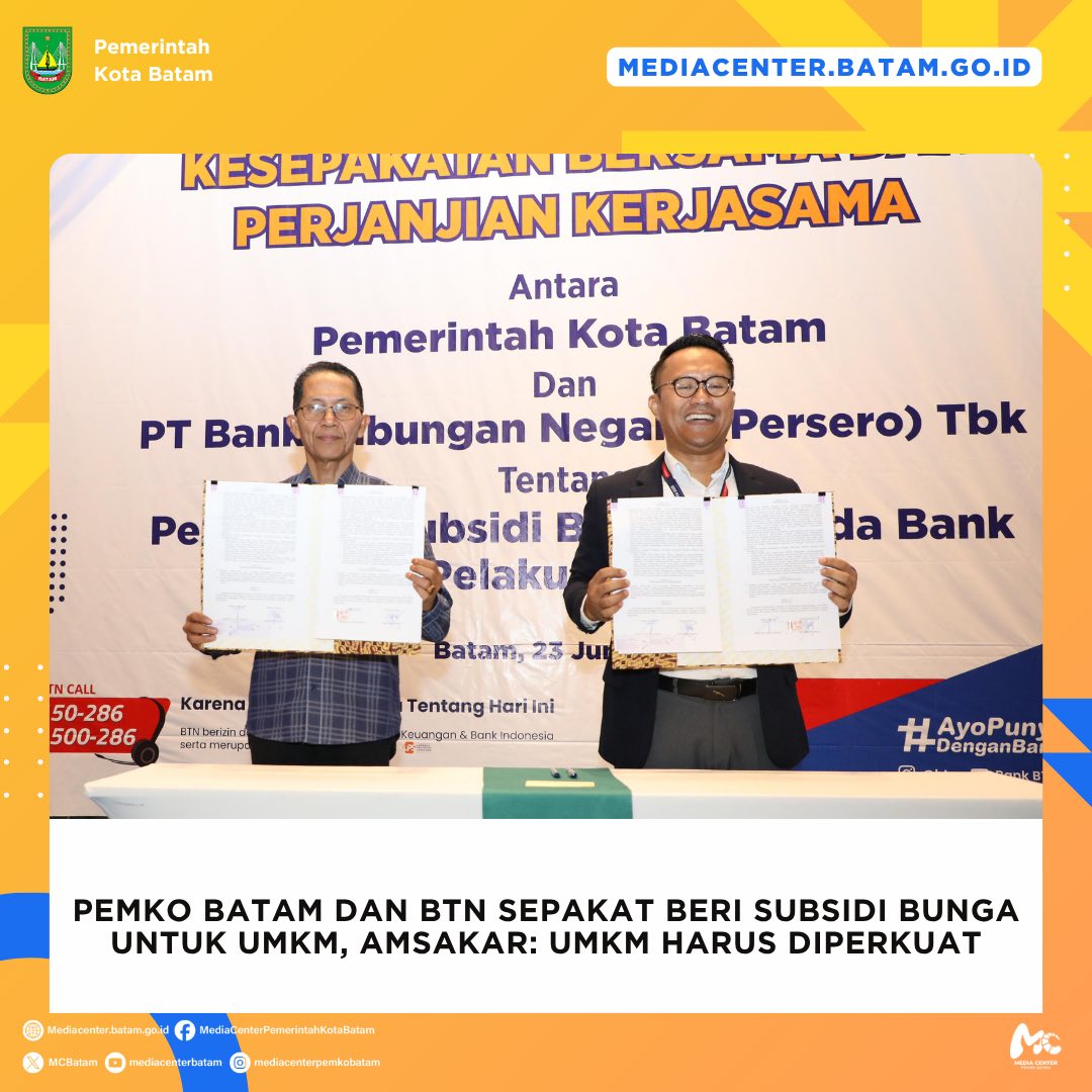 Batam / Berita / Walikota 24 Juni 2025 oleh mediacenter · Published 24 Juni 2025 𝐏𝐞𝐦𝐤𝐨 𝐁𝐚𝐭𝐚𝐦 𝐝𝐚𝐧 𝐁𝐓𝐍 𝐒𝐞𝐩𝐚𝐤𝐚𝐭 𝐁𝐞𝐫𝐢 𝐒𝐮𝐛𝐬𝐢𝐝𝐢 𝐁𝐮𝐧𝐠𝐚 𝐮𝐧𝐭𝐮𝐤 𝐔𝐌𝐊𝐌, 𝐀𝐦𝐬𝐚𝐤𝐚𝐫: 𝐔𝐌𝐊𝐌 𝐇𝐚𝐫𝐮𝐬 𝐃𝐢𝐩𝐞𝐫𝐤𝐮𝐚𝐭 𝐃𝐢𝐬𝐤𝐨𝐦𝐢𝐧𝐟𝐨 𝐁𝐚𝐭𝐚𝐦 – Pemerintah Kota Batam bersama PT Bank Tabungan Negara (Persero) Tbk menandatangani kesepakatan bersama tentang pemberian...